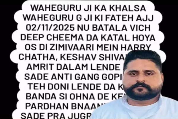 गैंग ने अपनी पोस्ट में खुलेआम धमकी भी दी है। पोस्ट में लिखा है: “वाहे गुरु जी का खालसा, वाहे गुरु जी की फतेह। 2 नवंबर 2025 को बटाला में जो दीप चीमा का कत्ल हुआ है, उसकी जिम्मेदारी मैं हैरी छेतिया, केशव शिवाला और अमृत दालम लेते हैं। …आज इसे इसकी सजा मिल गई है और बाकी प्रधान भी तैयार रहें। सरोपे उन्हें भी पड़ेंगे।”
