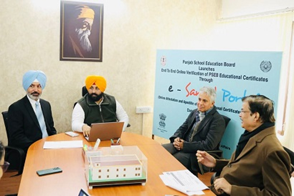 आज यहाँ पंजाब स्कूल शिक्षा बोर्ड की “ई-सनद” सेवा की शुरुआत के साथ बोर्ड के वर्तमान और पूर्व विद्यार्थी विस्तृत अंक-सूची (डीएमसी) और प्रमाणपत्रों का ऑनलाइन सत्यापन अब मात्र कुछ ही दिनों में करवा सकेंगे, जबकि पहले इसमें 40–45 दिन लगते थे। सरकार के अनुसार, इस कदम से पंजाब स्कूल बोर्ड से हर वर्ष पास होने वाले हज़ारों विद्यार्थियों को लाभ मिलेगा तथा बोर्ड द्वारा जारी प्रमाणपत्रों की विश्वसनीयता बढ़ेगी। साथ ही उच्च शिक्षा, रोज़गार और विदेश जाने के लिए तेज़ी से सत्यापन सुनिश्चित हो सकेगा।