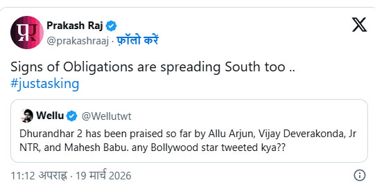 Entertainment Desk: आदित्य धर की हालिया रिलीज फिल्म ‘धुरंधर: द रिवेंज’ बॉक्स ऑफिस पर चर्चा का विषय बनी हुई है। जहाँ एक तरफ दक्षिण भारतीय सिनेमा के दिग्गज कलाकार इस फिल्म की जमकर तारीफ कर रहे हैं, वहीं दूसरी ओर बहुमुखी अभिनेता प्रकाश राज ने इस पर तीखा तंज कसा है।