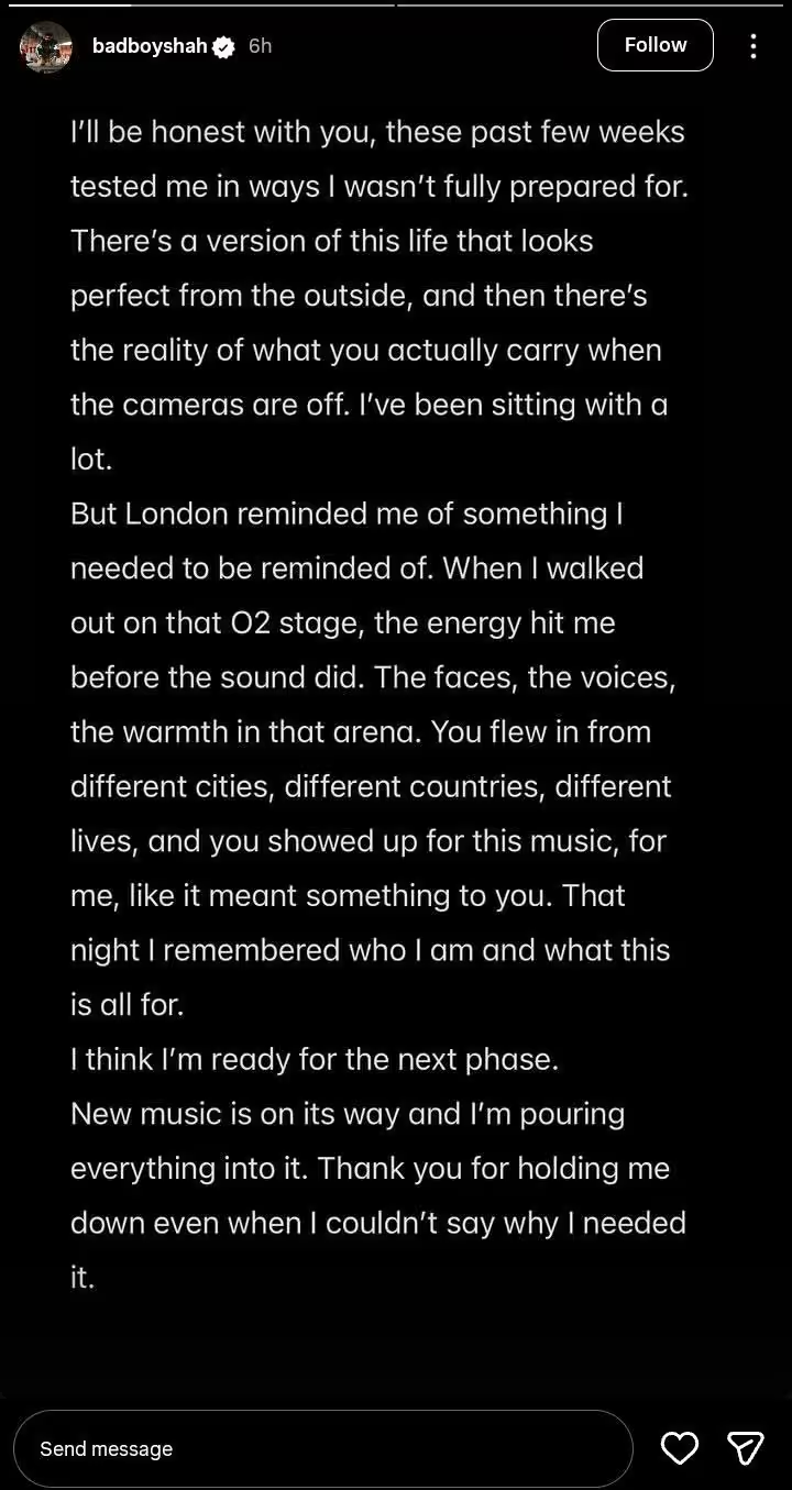 लंदन के प्रतिष्ठित O2 एरिना में परफॉर्म करने के बाद बादशाह ने इंस्टाग्राम पर एक लंबा और भावुक नोट शेयर किया। उन्होंने स्वीकार किया कि: